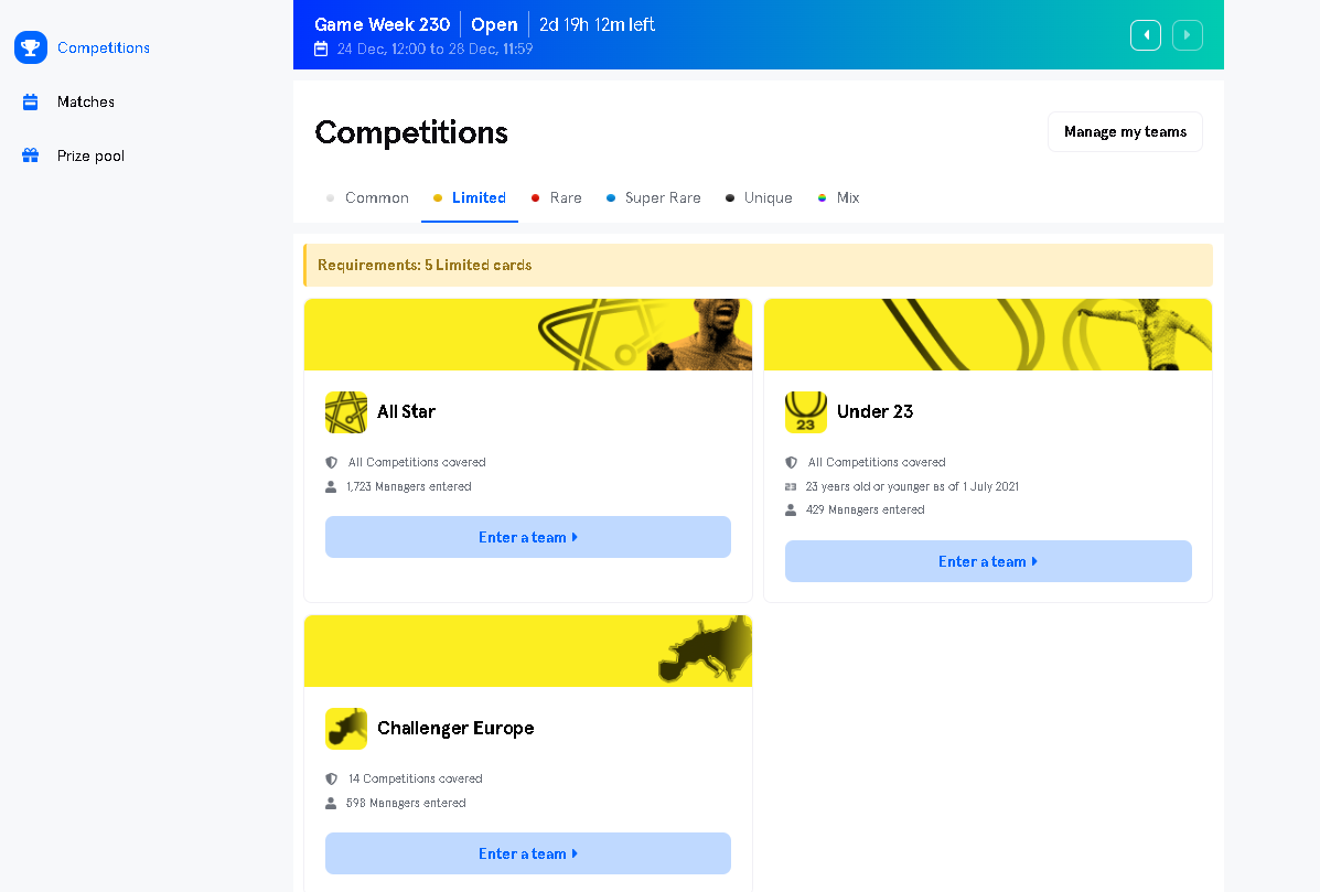 Note: A player can only be used on one team per GW. For example: If you have a version of Messi Limited you can put him either in All-Star, or in Champion Europe but not in both. If you have more than one card from the same player, you can use all of them during a GW, but not in the same team!