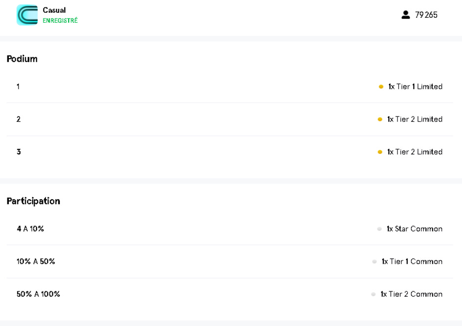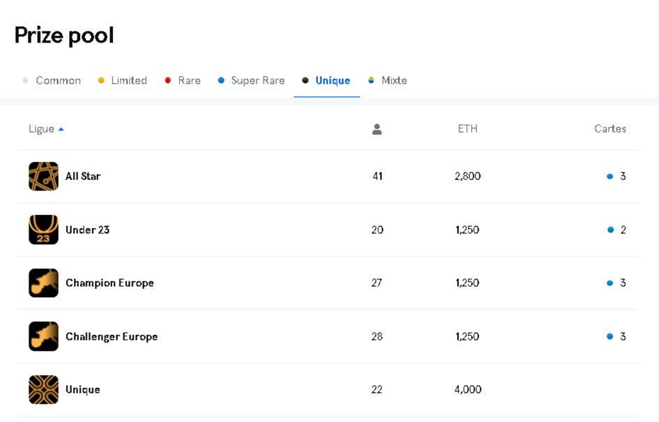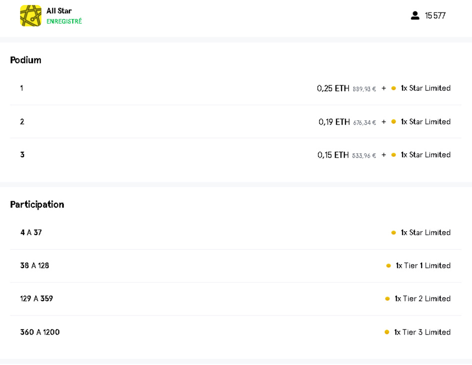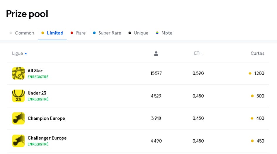 You can see that in the All-Star Limited competition there are 15 577 participants for 0.590 ETH (2100€ at the current Ethereum rate) and 1200 limited cards distributed as a reward.