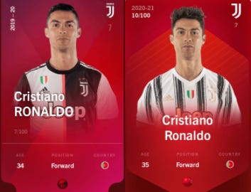 You can also see “54/100” for Ronaldo's 2019-2020 season card above and “11/100” for his 2020-2021 season card.
